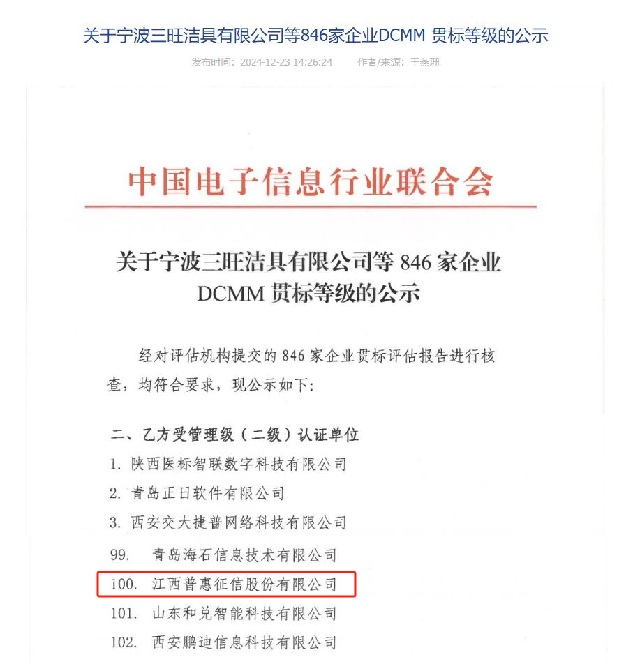 近日,中国电子信息行业联合会公示了最新一批获得数据管理能力成熟度(DCMM)等级证书单位名单,江西金控集团所属江西普惠征信股份有限公司顺利通过DCMM二级认证。