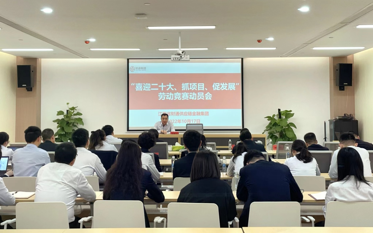 在全党全国各族人民热烈庆祝党的二十大胜利召开之际,为深入贯彻落实习近平总书记在大会上作的重要报告精神,结合公司发展实际,冲刺四季度、决战全年胜,坚决完成全年各项发展任务。10月17日,省财通供应链集团举行“喜迎二十大、抓项目、促发展”劳动大竞赛动员会,公司党总支书记、董事长蔡建城作了动员讲话。