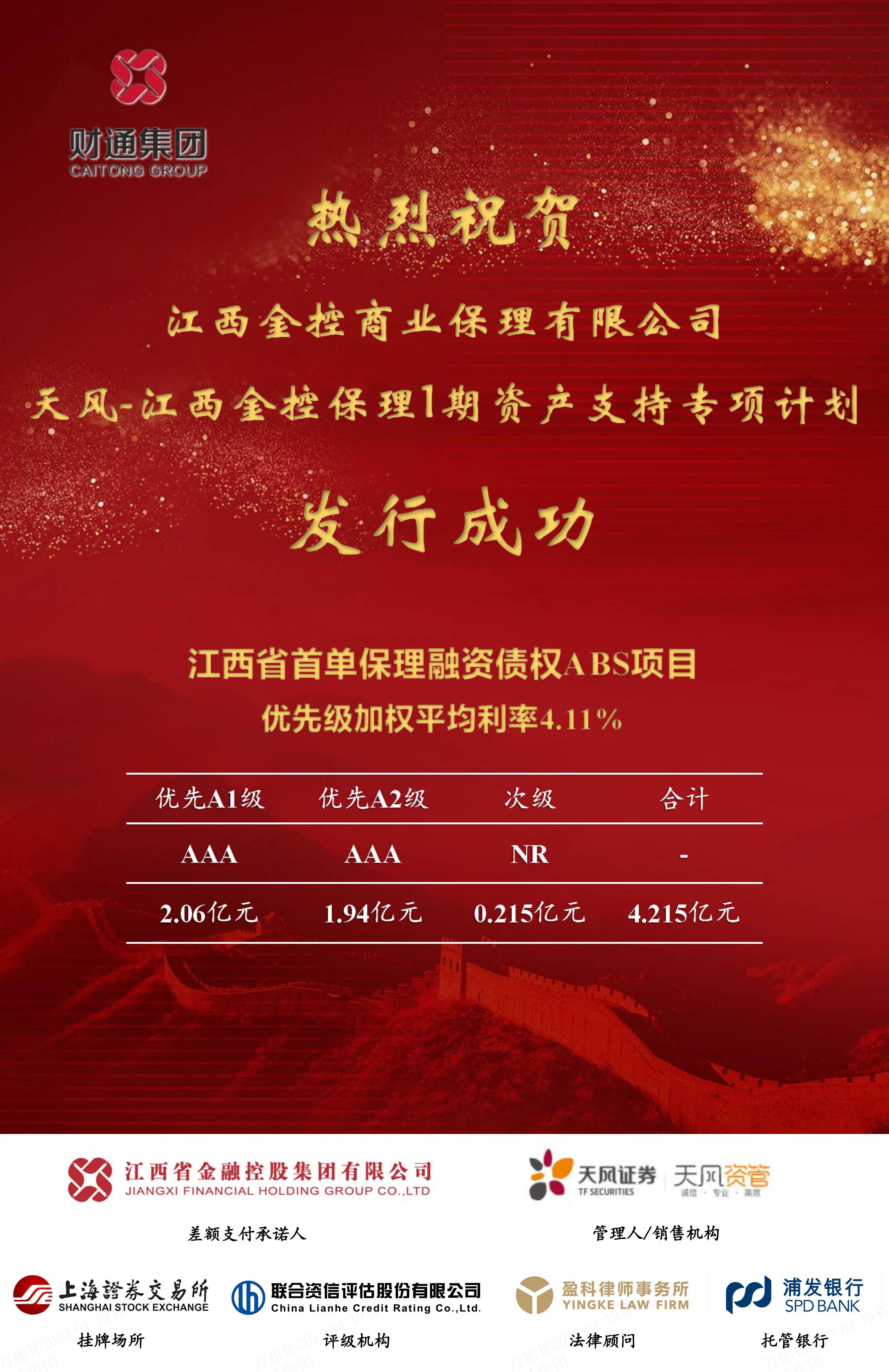 4月19日,省财通供应链集团集团旗下江西金控商业保理有限公司(以下简称 金控保理)作为原始权益人的“天风-江西金控保理1期资产支持专项计划”在上海证券交易所成功发行!发行规模4.215亿元,优先级加权平均利率4.11%。本次发行是金控保理公司首单应收账款资产证券化业务,也是江西省内保理公司首单保理ABS。