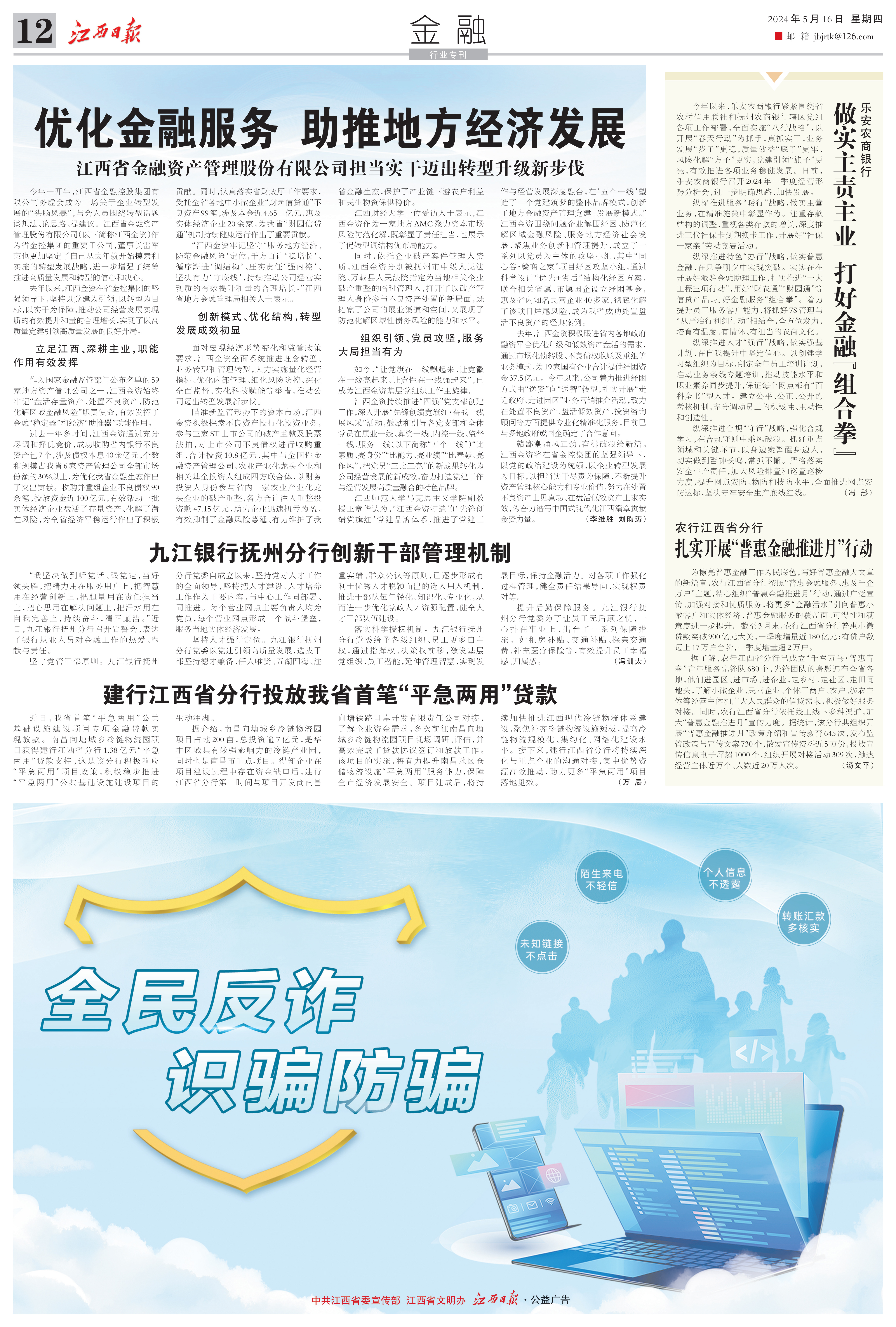 5月16日,《江西日报》第十二版金融行业专刊头条报道江西省金融资产管理股份有限公司专题文章《优化金融服务 助推地方经济发展》,现将全文转载如下。