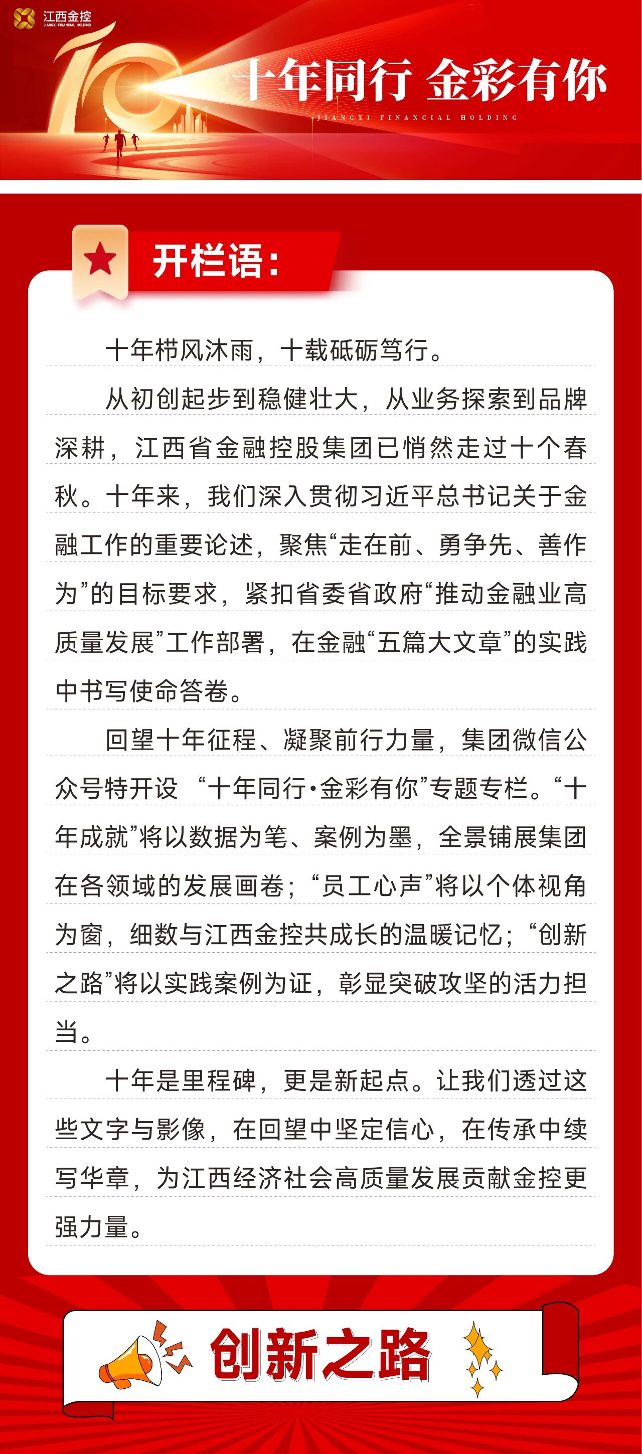 十载砥砺磨一剑,征程万里再扬鞭。站在新的历史起点,肩负服务江西经济社会高质量发展的时代使命,集团上下将深入学习贯彻习近平新时代中国特色社会主义思想,全面贯彻落实省委、省政府决策部署,以国有金融企业的责任担当为舵,以十年积淀的坚实底气为帆,秉持“稳健、高效、创新、协同”的核心价值观,坚守“融天下、汇赣鄱”的品牌理念,持续深化改革创新、增强核心功能、提升核心竞争力,奋力开创集团高质量发展和转型升级新局面,为谱写中国式现代化江西篇章作出更大贡献。
