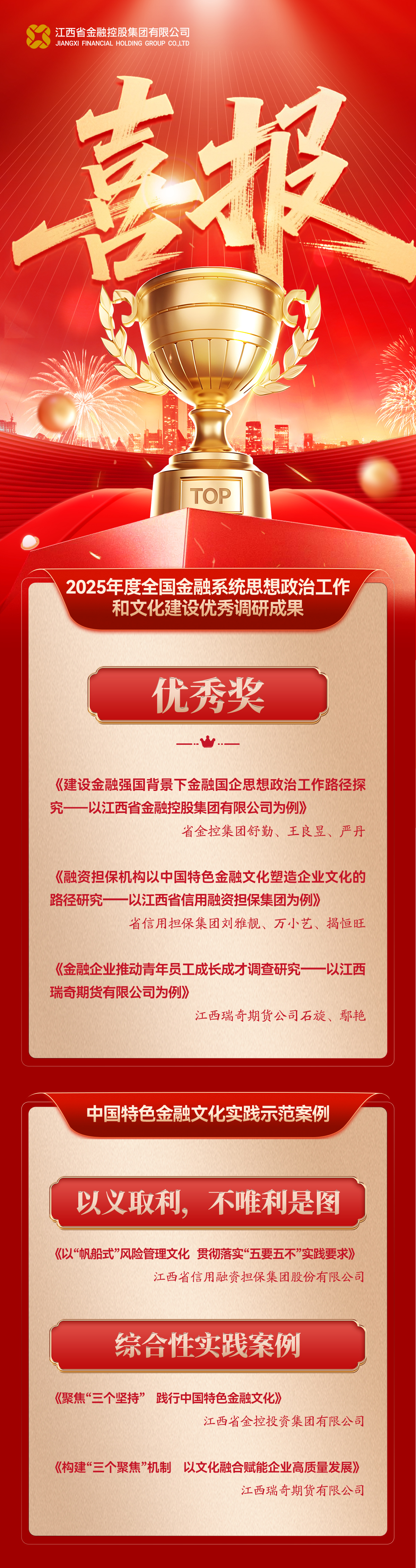 近日,中国金融思想政治工作研究会发布《关于2025年度全国金融系统思想政治工作和文化建设优秀调研成果的通报》和《关于推介发布中国特色金融文化实践十佳案例及示范案例的通知》,省金控集团及相关子公司获评优秀调研成果和示范案例各3个。