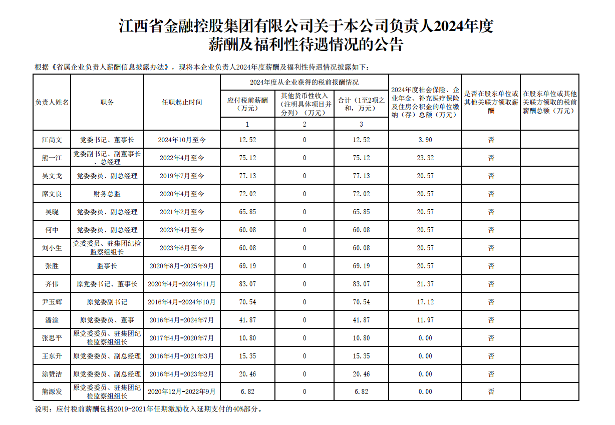 江西省金融控股集团有限公司关于本公司负责人2024年度薪酬及福利性待遇情况的公告